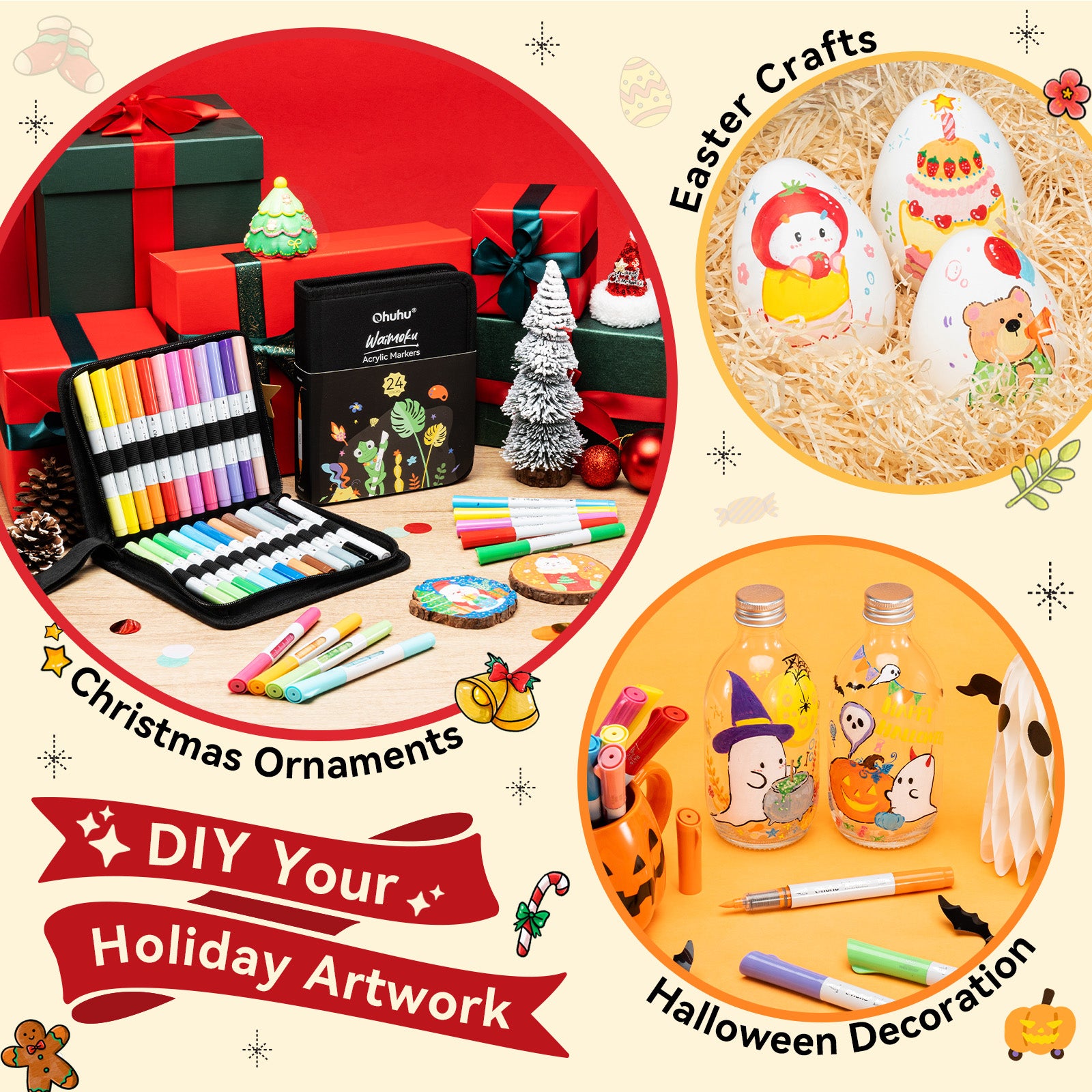 Ohuhu acrylic paint pens include 24 vibrant, high-opacity colors that lay down bold, even coverage with smooth ink flow and consistent results when dry. The dual-tip design features a fine bullet tip for details and a flexible brush tip for filling larger areas, while strong adhesion works on surfaces like wood, rock, glass, ceramic, plastic, and canvas. A visible ink window lets you check levels easily, and the portable pouch keeps everything organized—perfect for artists and creative gifting.
