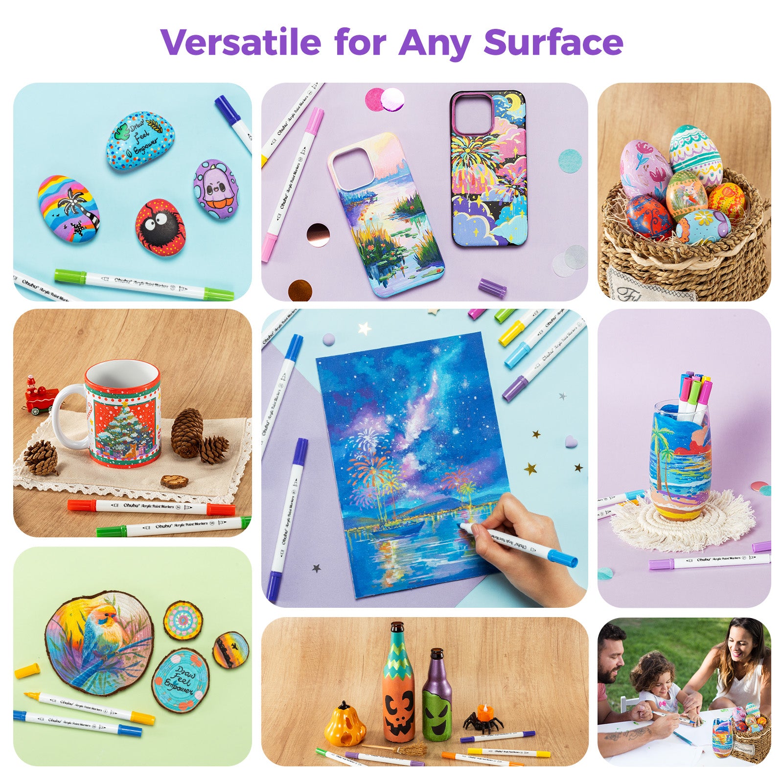 Ohuhu Acrylic Paint Markers Cotton-Core 72 Colors offer vibrant, highly opaque pigmentation and smooth coverage on nearly any surface. Featuring premium cotton-core tips for consistent ink flow, these acrylic markers are perfect for rock painting, canvas art, DIY crafts, ceramic, wood, glass, and more. With 72 rich colors, artists, crafters, and beginners can enjoy effortless blending, long-lasting color, and mess-free creativity. Ideal for decorating, journaling, and professional art projects.